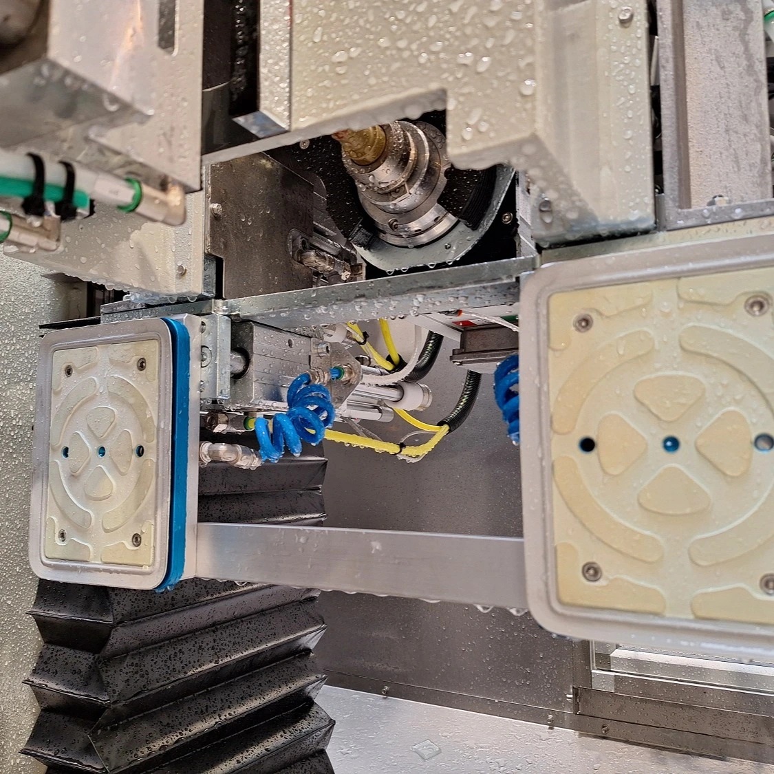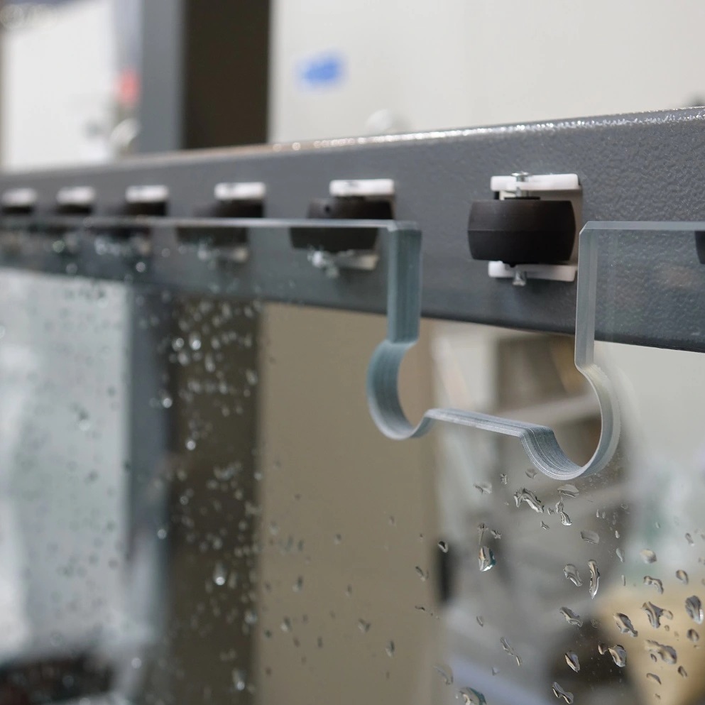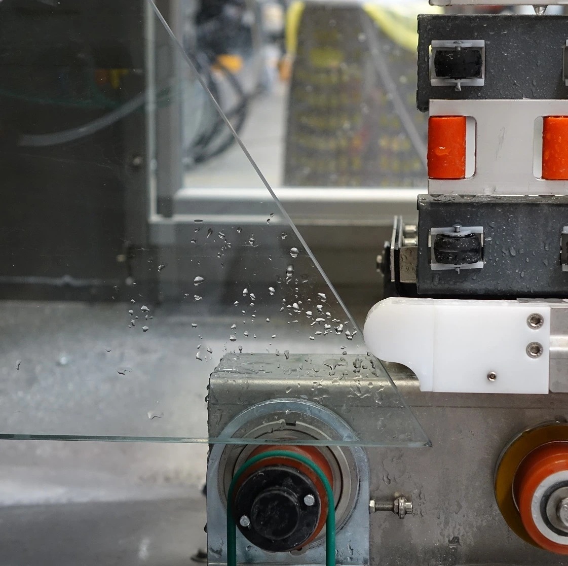 Den vertikala konstruktionen ger ett kompakt utförande och effektiv materialhantering. Glasplattan positioneras automatiskt via motoriserade valsar och fixeras stabilt med sugkoppar nära arbetsområdet, vilket säkerställer vibrationsfri bearbetning och jämn kvalitet – även vid serieproduktion.