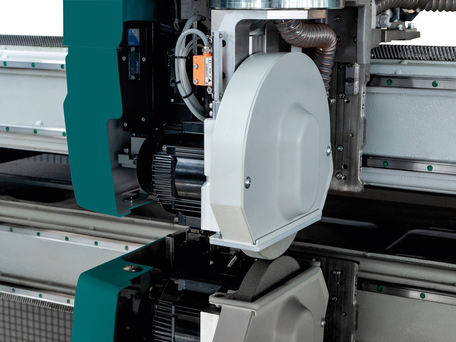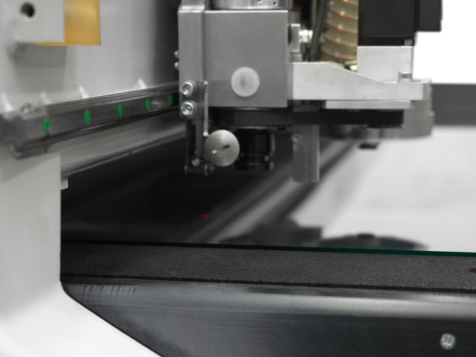 Det automatiska verktygsväxlingssystemet med sex positioner väljer rätt skärhjul och skärparametrar baserat på glasets typ och tjocklek. Det tangentiella skärhjulet med integrerad dammuppsamling säkerställer effektiv borttagning av Low-E-beläggning vid både raka och formskurna snitt. Skärhjulstrycket regleras automatiskt via en digital, proportionell ventil för jämn och kontrollerad ritsning.