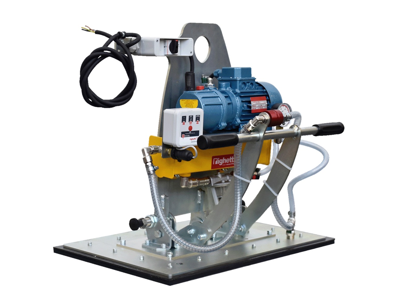 M1A är pneumatiskt driven och används där tryckluft finns tillgänglig, till exempel i verkstad eller fasta produktionsmiljöer. M1EB är elektriskt driven med vakuumpump och finns i både 230 V och 400 V utförande, vilket gör den lämplig för kontinuerlig drift. M1B är batteridriven med inbyggt uppladdningsbart batteri och levereras med laddare, vilket gör den särskilt lämplig för montering och arbete på byggarbetsplats utan extern energiförsörjning.