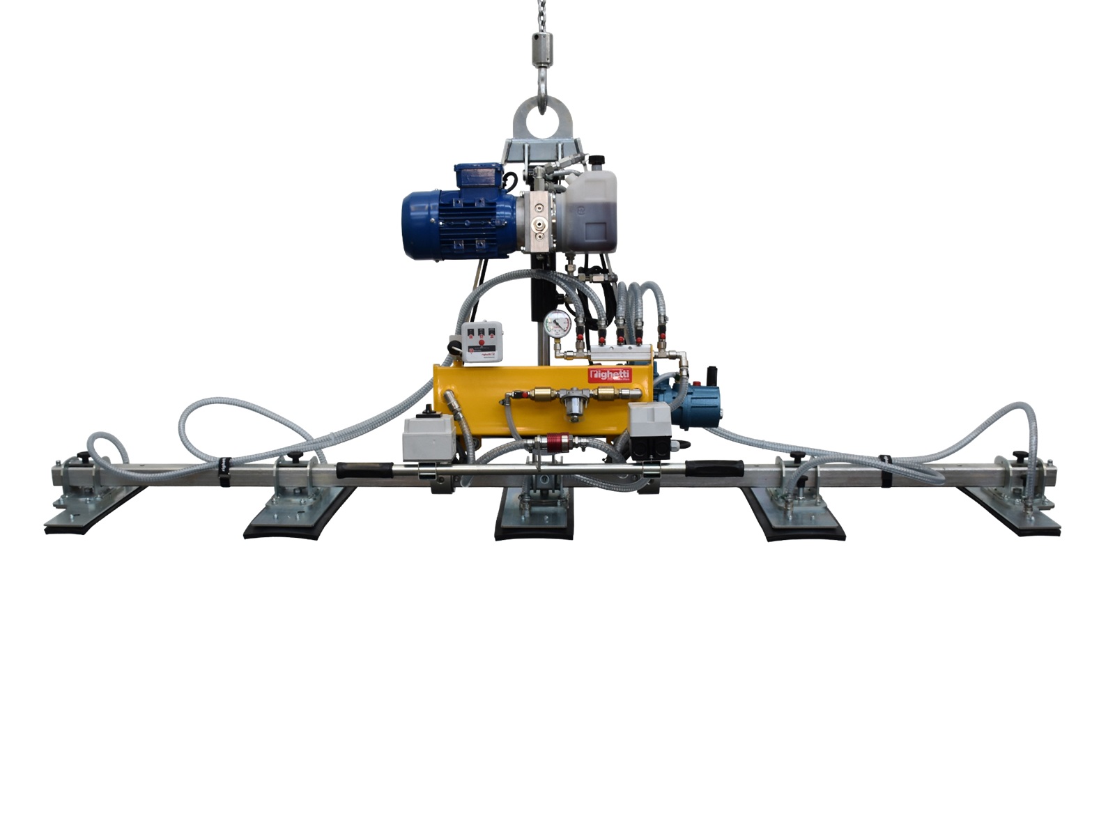 Maskinen är utrustad med 5 rektangulära sugkoppar (580 × 180 mm) monterade på en 2 200 mm lång lyftbalk. Varje sugkopp kan roteras 90°, vilket ger flexibilitet vid placering och hantering. Vakuumsystemet inkluderar vakuumtank, backventil samt ett effektivt damm- och kondensfilter som skyddar systemet och ger snabb uppsugning.