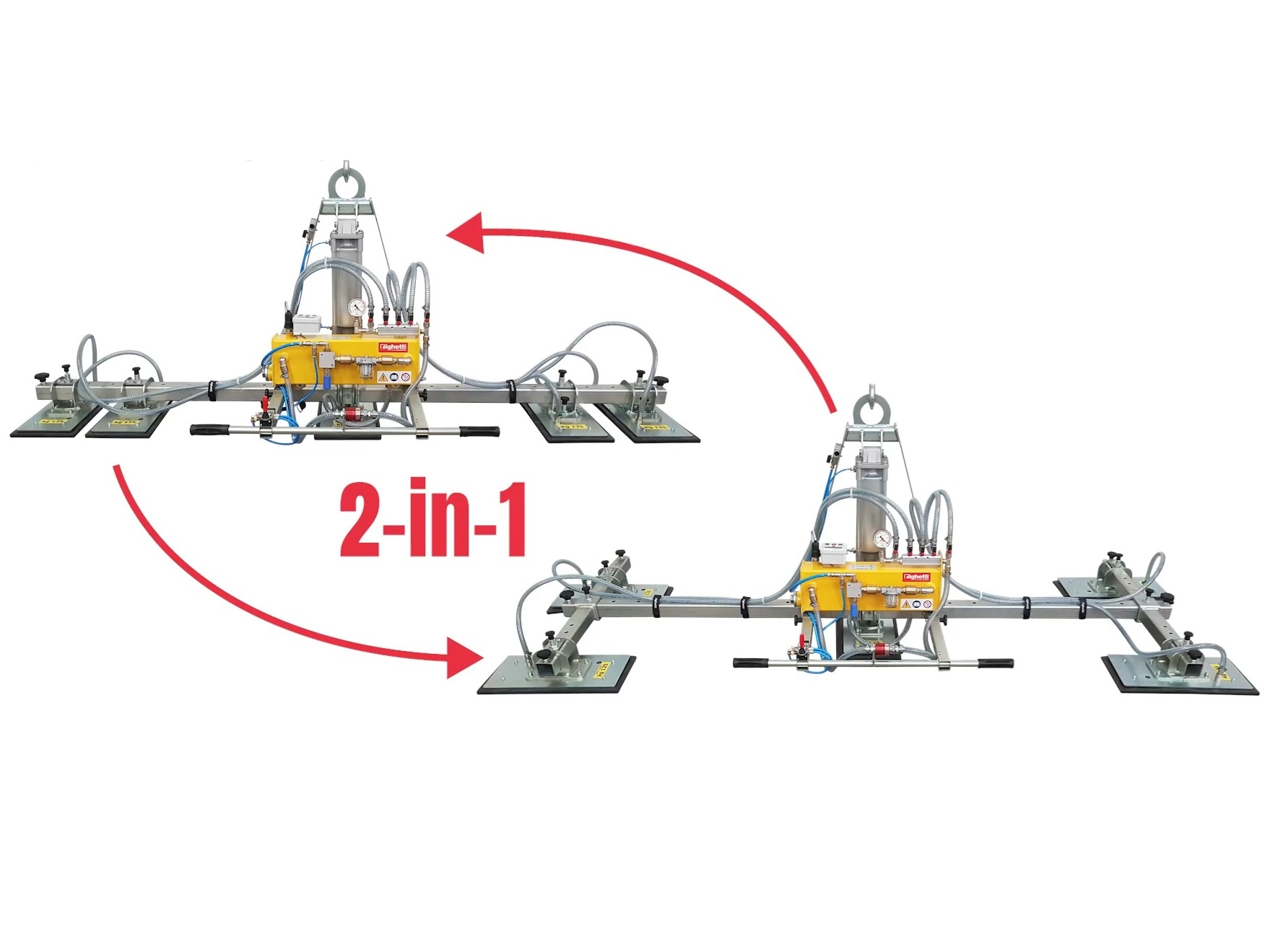 Modellen är utrustad med fem sugplattor och har en maximal lyftkapacitet på upp till 625 kg. Pneumatisk tilt 0–90° ger en kontrollerad och säker övergång mellan horisontell och vertikal position och bidrar till precis placering vid hantering och montering av stora och tunga objekt.