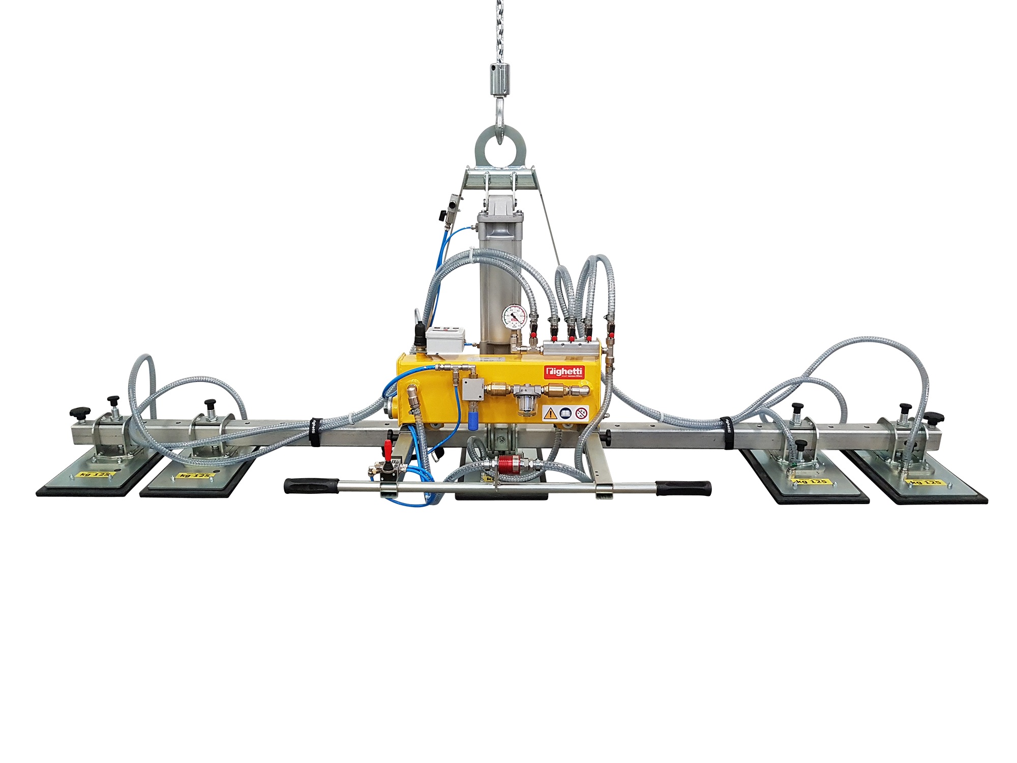 Righetti P5A625K-X är en pneumatisk vakuumlyft utvecklad för hantering av stora köksbänksplattor och stenplattor i natursten, keramik och andra icke-porösa material. Vakuumlyften används tillsammans med kran, truck eller annan lämplig lyftutrustning och är konstruerad för både horisontell och vertikal hantering.